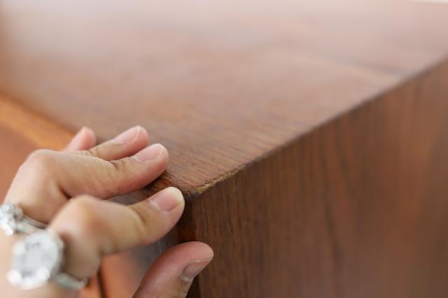 チーク家具の魅力は、製造から60年近く経過していても、このような質感を楽しむことができ、自分で愛着を持って”育てる”ことができるところです。日々のお手入れについては、ハワード社/オレンジオイル 又は フィーデンワックスでのお手入れをお勧めしています。”使う前が一番美しい”、のではなく、”使いながら暮らすことが楽しい”を体感していただけると嬉しいです。