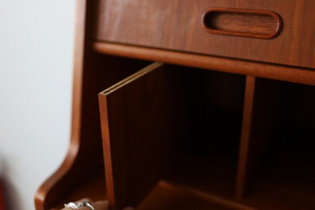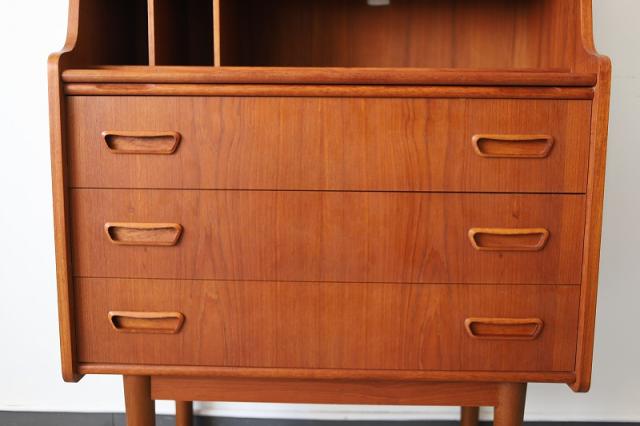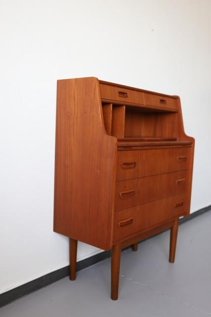 北欧デンマーク買付のライティングビューローです。ビューローとは、書棚や引き出しなどの収納家具とデスクが一体化した家具のことをいいます。これは天板を手前に引き出すことでデスクとして使用することが出来るタイプのデザインです。
