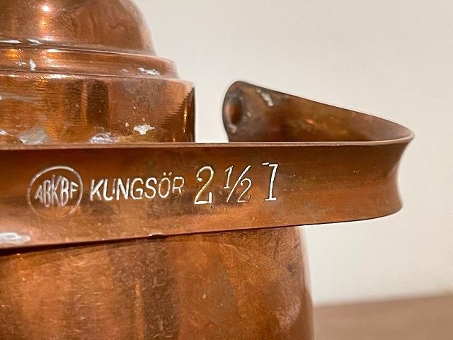 デンマークで出会ったABKBF KUNGSOR社の銅製ケトルです。ボディの直線的なフォルムと、注ぎ口の曲線のデザインが特徴です。容量は2.5リットルと記されています。