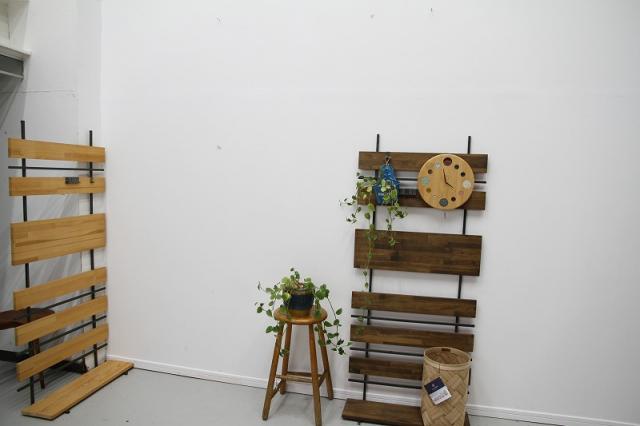 壁面に立てかけて使う目的で製作しています。自立していませんので、壁面に立てかけてお使いください。L型ですので、ぶら下げるアイテムの重量にご注意の上、お使いください。