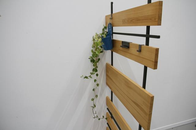 壁面に立てかけて使う目的で製作しています。自立していませんので、壁面に立てかけてお使いください。L型ですので、ぶら下げるアイテムの重量にご注意の上、お使いください。