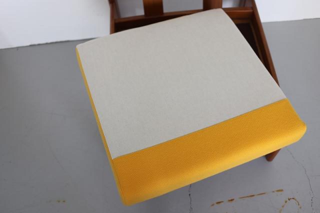 ドイツ買付便の一人掛けソファ。ソリッドチークのフレームから溢れる重厚感、そして丸みをつけた丁寧なつくりは見事です。生地の張替えとウレタン交換済、スプリング部分を保護するための生地も張替えています。