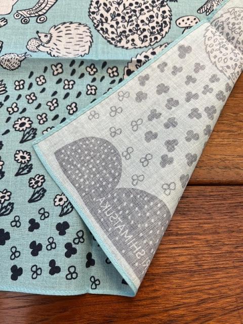 絵本『しずかなところはどこにある?』の登場人物たちがピクニックを楽しんでいる様子を描き下ろした爽やかな色合いのハンカチです。