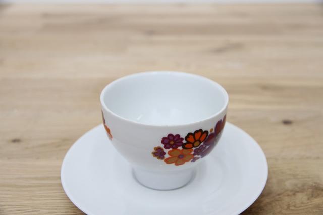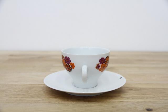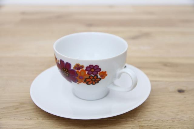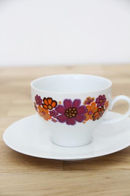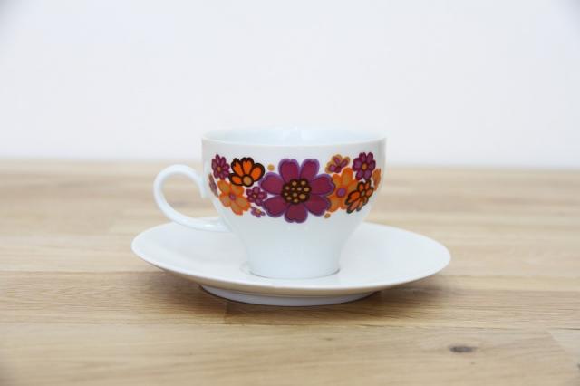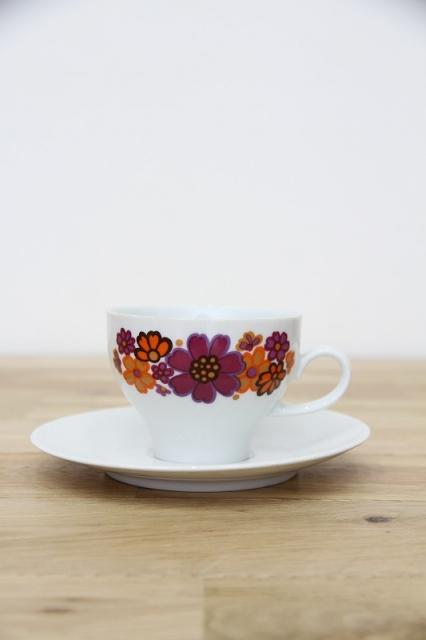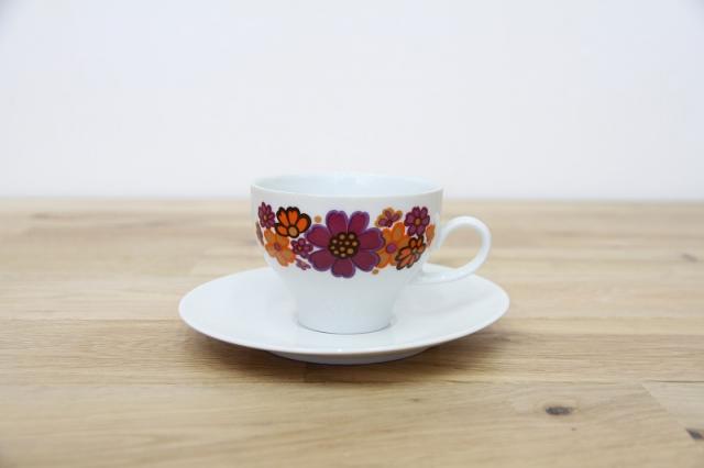 ドイツの陶磁器メーカー‘Winterling’社のカップ&ソーサーです。オレンジと紫色のコスモスのようなお花がとてもレトロで可愛いプリントデザイン。ソーサーがとてもシンプルなので、お花が際立つデザインですね。