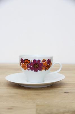 ドイツの陶磁器メーカー‘Winterling’社のカップ&ソーサーです。オレンジと紫色のコスモスのようなお花がとてもレトロで可愛いプリントデザイン。ソーサーがとてもシンプルなので、お花が際立つデザインですね。