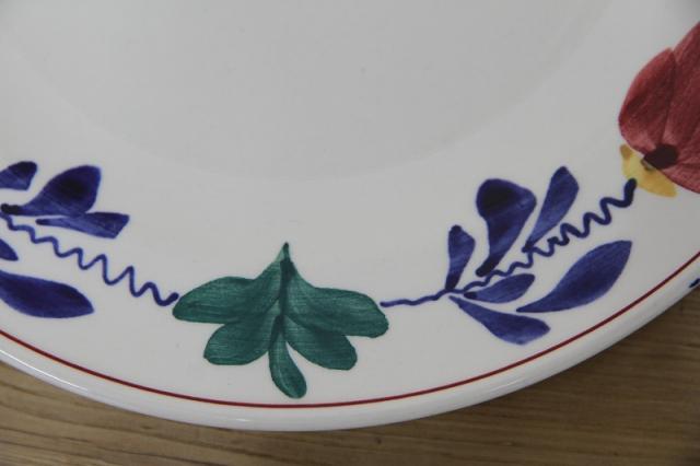 BOCH「Boerenbont」(製造年は1960年代から1980年代)シリーズのディナープレート。グリーン・ネイビー・バーガンディーの色で連なるようにボタニカルデザインがハンドペイントにて描かれている素敵な一点。とても状態が良いヴィンテージ品です。