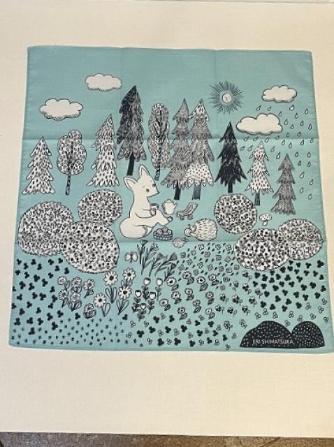 絵本『しずかなところはどこにある?』の登場人物たちがピクニックを楽しんでいる様子を描き下ろした爽やかな色合いのハンカチです。