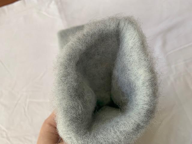 温かさの秘密は、3重構造の特殊な編み方と、内側のもこもこした仕上げによるものです。