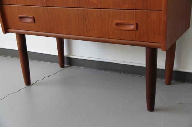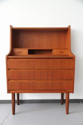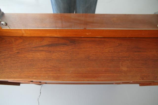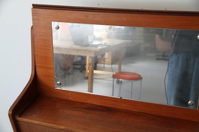 北欧デンマーク買付のライティングビューローです。ビューローとは、書棚や引き出しなどの収納家具とデスクが一体化した家具のことをいいます。これは天板を手前に引き出すことでデスクとして使用することが出来るタイプのデザインです。その天板を持ち上げると鏡が付いている仕様です。
