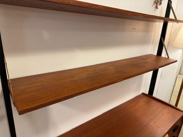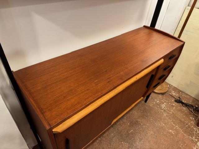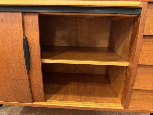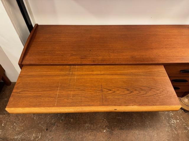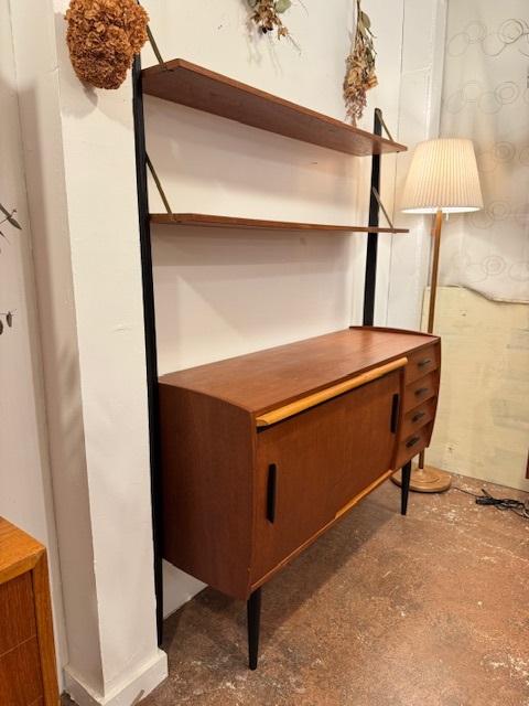 温かみのあるチーク材をベースに、ブラックのフレームが全体を引き締めるスタイル。直線的で無駄のないフォルムは、当時の北欧デザインが大切にしていた“機能美”をそのまま体現しています。
