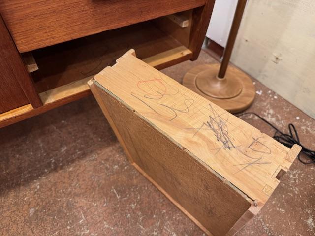 経年によるキズや引き出し内部の書き込みなどは見られますが、それもまた長い年月を経てきた証。新品にはない、時間がつくり出した風合いとして、この家具の個性となっています。